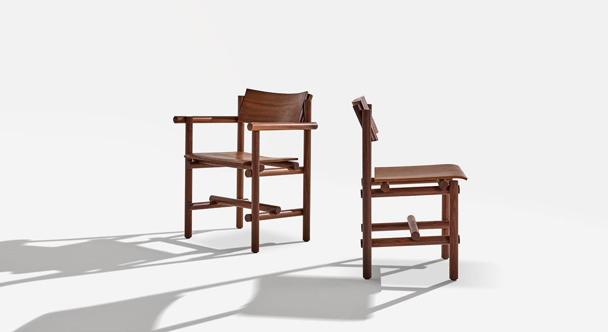 The clarity of Muecke’s work stems from his use of repetition. In the case of this collection, distinct joinery is used throughout, with rounded wood pieces passing each other on nearby planes and connecting where they meet by a floating tenon. The result is a stable linking system with an internal logic that amplifies the space around it. As explained by Muecke, “only when something has internal logic does it have a have a chance at external relationships with other things.”